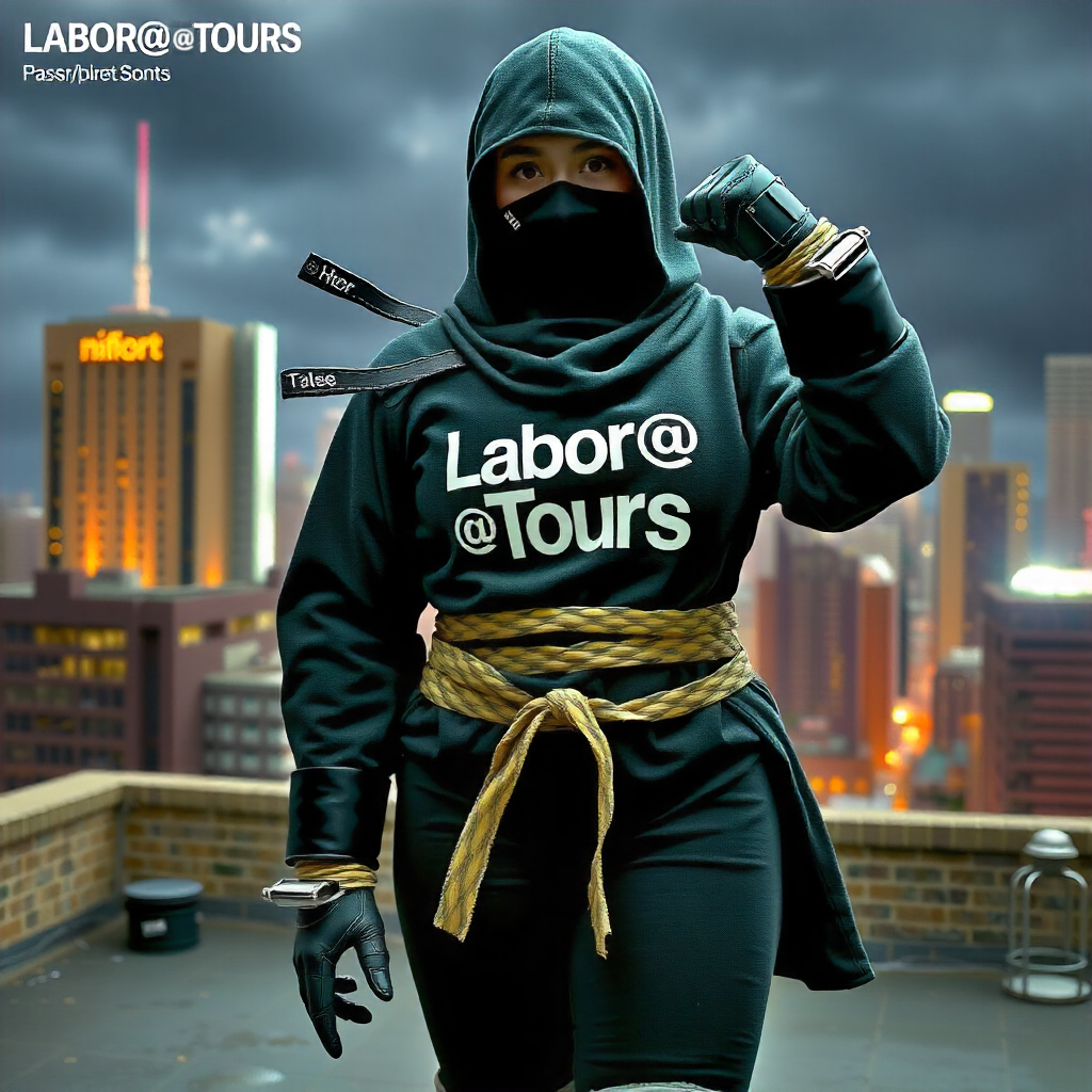 prompt :high detailed texture, photograph, realistic, raw photo of a curvy female ninja with large hips large breast with Labor@Tours logo on her chest, standing on rooftop with a dark dystopian city in the background, dynamic pose, fierce, extremely intricate, extremely detailed, ominous lighting, dramatic lighting, dark stormy night, shot with Hasselblad, long exposure